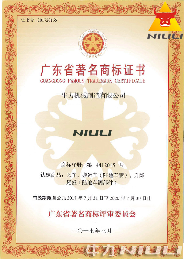 2017年7月,牛力榮獲廣東省著名商標(biāo),廣東省著名商標(biāo)是指在廣東省內(nèi)具有較高市場(chǎng)信譽(yù)、為相關(guān)公眾所熟知的注冊(cè)商標(biāo)。這次獲頒 廣東省著名商標(biāo)證書,標(biāo)志著牛力的品牌知名度已經(jīng)達(dá)到相當(dāng)?shù)母叨群退疁?zhǔn),叉車、搬運(yùn)車、升降尾板已經(jīng)擁有物流設(shè)備制造業(yè)的著名品牌口碑。