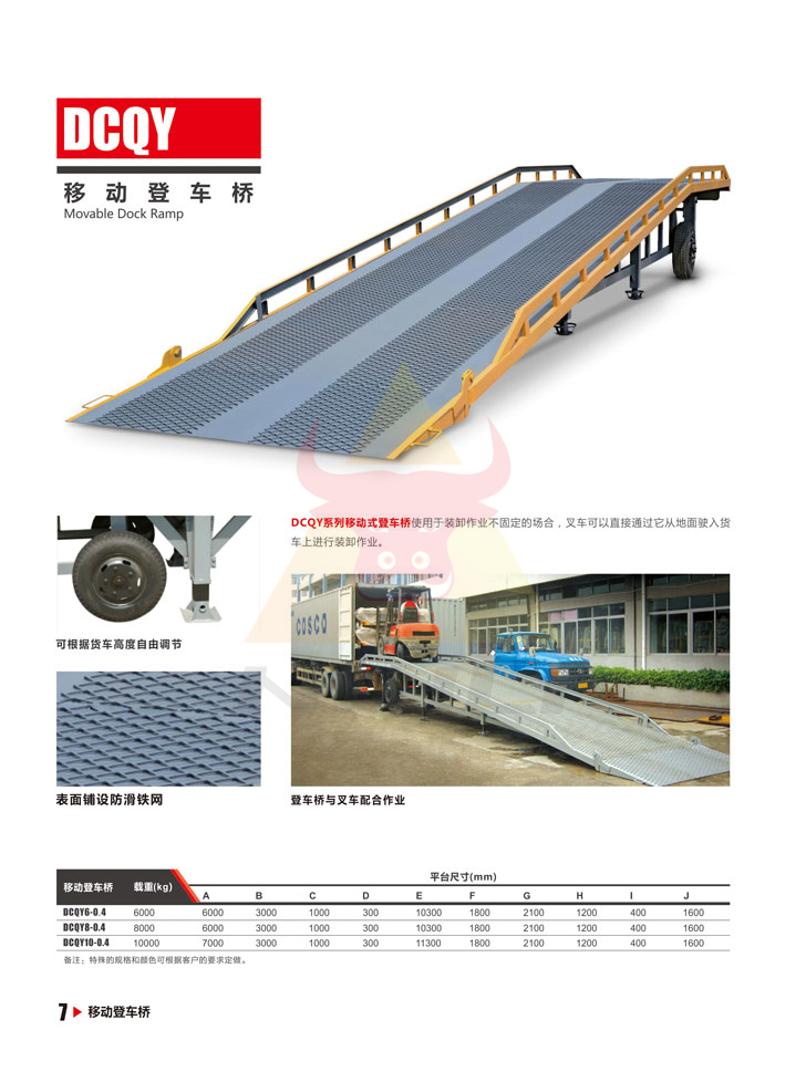 DCQY系列移動(dòng)式登車橋適用于裝卸作業(yè)不固定的場(chǎng)合,叉車可以直接通過(guò)它從地面駛?cè)胴涇嚿线M(jìn)行裝卸作業(yè),該產(chǎn)品具有高強(qiáng)度的焊接鋼構(gòu),表面鋪設(shè)防滑鐵網(wǎng),使裝卸作業(yè)更安全、更快捷、更高效。