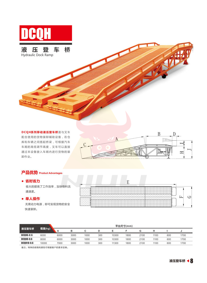 DCQH系列移動式登車橋使用于裝卸作業(yè)不固定的場合,叉車可以直接通過它從地面駛入貨車上進行裝卸作業(yè),該產品具有高強度的焊接鋼構,采用手動液壓泵升降,不需外接電源即可輕松實現(xiàn)登車橋高度的調節(jié),使裝卸作業(yè)更快捷高效。