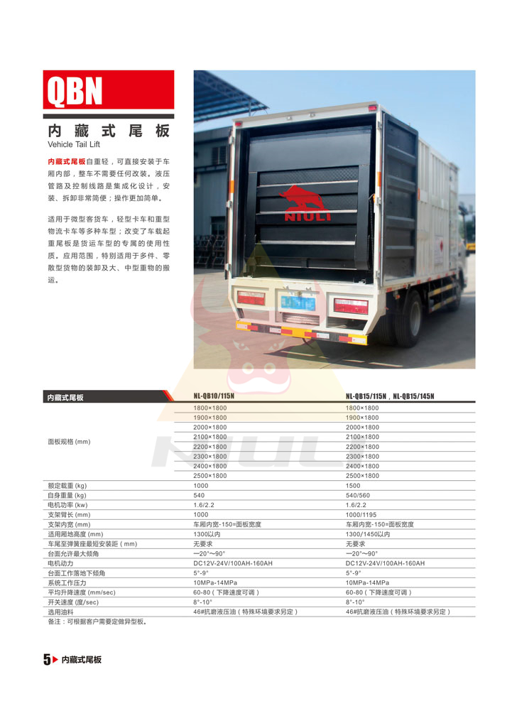內(nèi)藏式尾板自重輕,可直接安裝于車廂內(nèi)部,整車不需要任何改裝,液壓管路及控制線路是集成化設(shè)計,安裝、拆卸非常簡便;操作更加簡單。適用于微型客車,輕型卡車和重型物流卡車等多種車型。