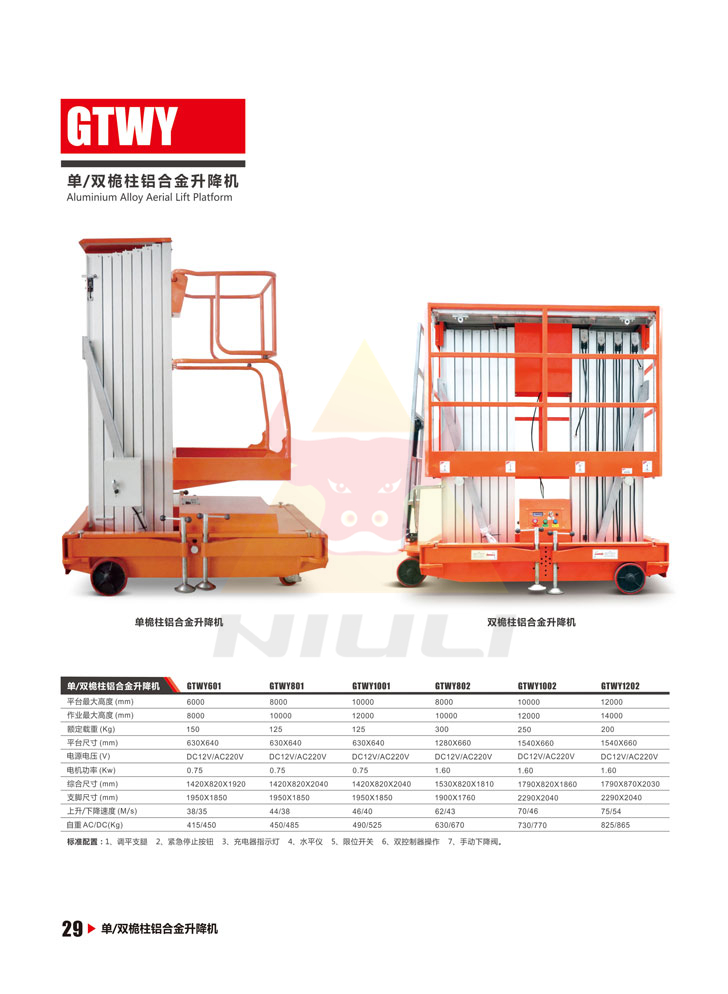 采用高強度航空鋁合金金桅桿設計,結(jié)構(gòu)緊湊,機身設計輕巧,機身底座設有活動輔助輪,提供轉(zhuǎn)彎的良好性能,適合各工商業(yè)用途,如建筑安裝,工廠維修、保養(yǎng),物業(yè)管理,展覽搭建,酒店設備維護、清潔,廣告安裝懸掛等。