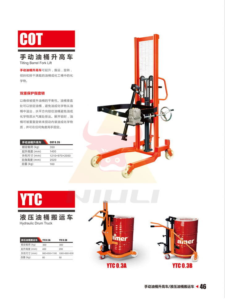 手動油桶升高車可起升,搬運,旋轉,傾斜和排干滿載的油桶或化工桶中的化學物。雙重保護指套鎖以確保被提升油桶的平衡性。油桶垂直處可以鎖定油桶,避免油或化學物質從油桶中溢出。