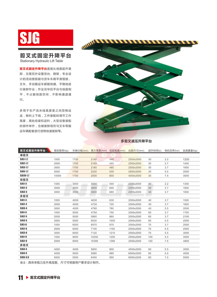 SJG多層剪叉固定液壓升降平臺(tái)多用于生產(chǎn)流水線高度差之間貨物運(yùn)送,物料上下線,工件裝配時(shí)調(diào)節(jié)工作高度,高處給裝機(jī)送料,大型設(shè)備裝配時(shí)部件舉升,倉儲(chǔ)裝卸場所與叉車等搬運(yùn)車輛配套進(jìn)行貨物快速裝卸等。