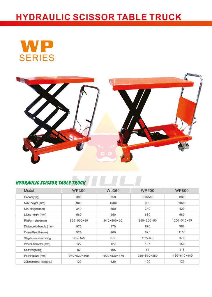 WP Hydraulic Table Truck is made of high-strength steel, the design structure is reasonable, safe and stable and reliable, built-in safety valve, sealed cylinder, manual control hydraulic system movements, easy to operate simple. With