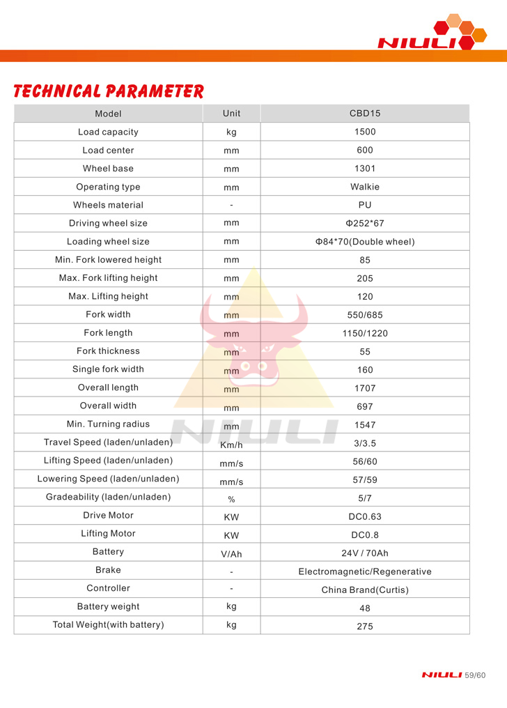 | Model | Load capacity(kg) | Max.Lifting height(mm) | Fork length(mm) | Min.Lifting height(mm) | Truck weight(kg) |